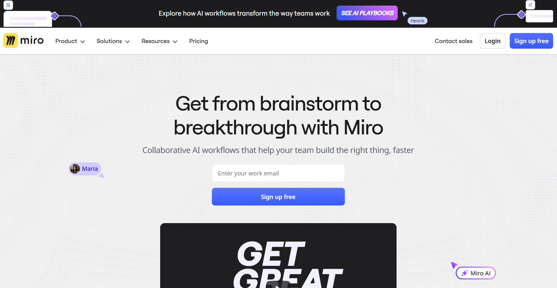 - What it does: Miro provides an infinite digital canvas where teams can add sticky notes, diagrams, drawings, and frameworks for brainstorming and planning. Multiple people can work on the same board at once.