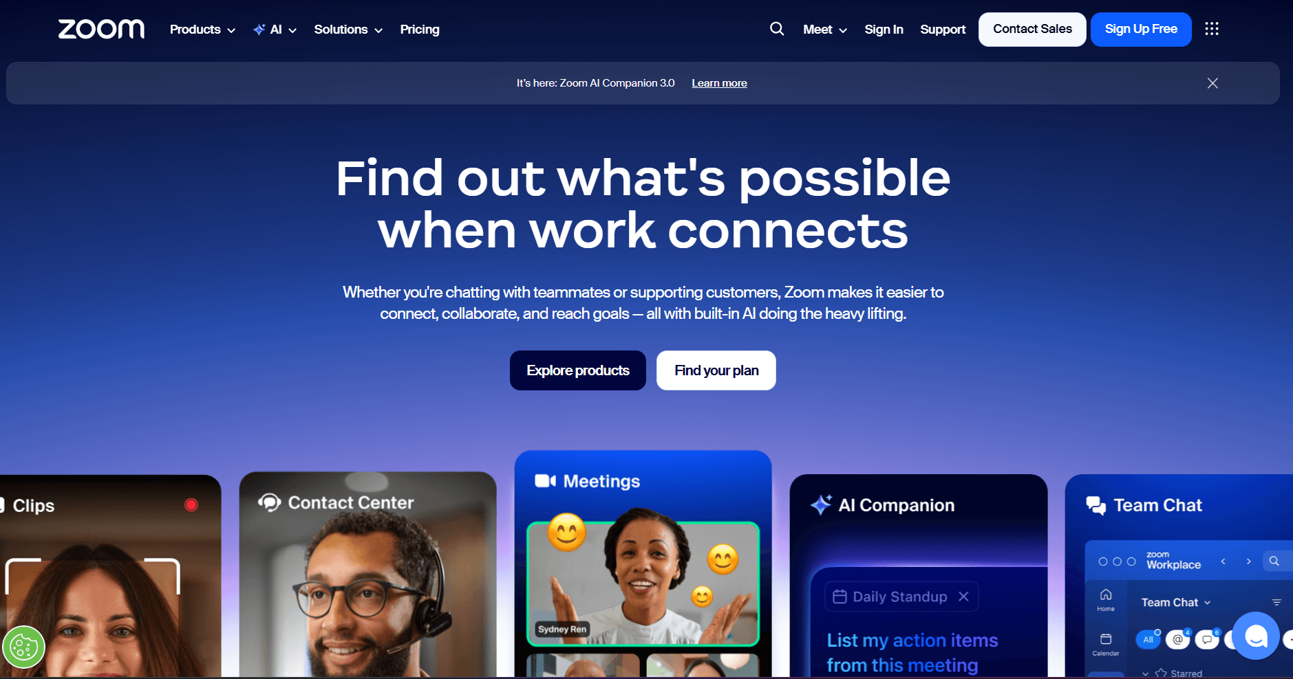 - What it does: Zoom provides video conferencing with HD quality, screen sharing, and recording. It supports meetings from small team calls to large webinars with thousands of participants.